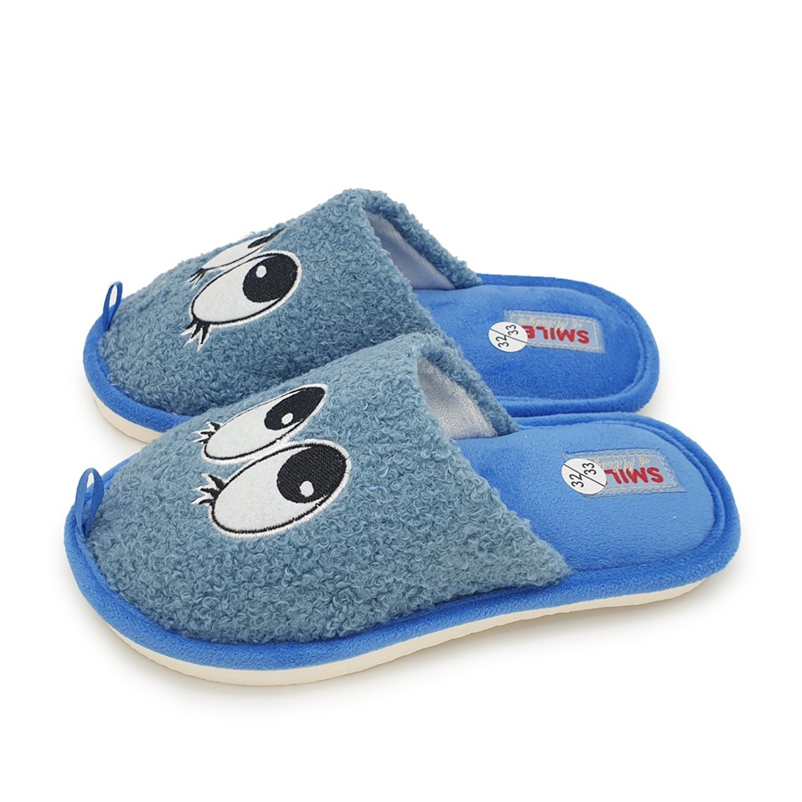 Верх тапочек сшит из искусственного меха, который декорирован большими мультяшными глазками.