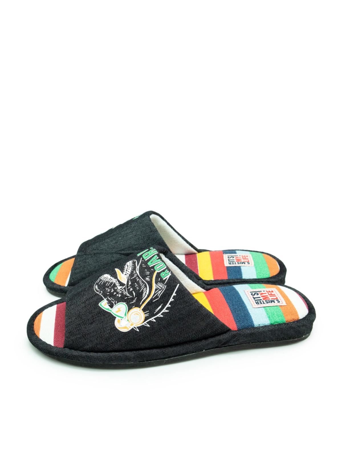 Верх тапочек украшен рисунком, динозаврика в наушниках и солнечных очках, а стелька выполнена в разноцветную полоску.