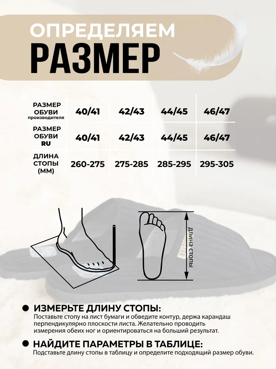 Эта модель мало мерит. Каждая пара изготовлена с применением самых передовых технологий - детали аккуратно ПРОШИТЫ и ПРОКЛЕЕНЫ, гарантируя долгий срок службы.Благодаря инновационным усовершенствованиям, наша модель тапочек заслуженно превосходит многие другие аналоги на рынке. В нашем ассортименте представлены тапочки на каждый сезон: из натуральной кожи, трикотажа, резины и других материалов, обеспечивая ваш домашний уют. Это прекрасное решение не только для дома, но и для дачи, бани и даже для ваших гостей. Продуманный дизайн, а также ортопедическая подошва из материала ЭВА (EVA), обеспечивают стабильность, не скользят и снижают усталость ног. Наши тапочки по праву считаются лучшими на рынке. Они идеально подойдут не только для домашнего использования, но и в качестве рабочей обуви, особенно когда вам нужно много времени проводить на ногах. Благодаря широкому размерному ряду, они подходят для использования в гостиницах, больницах, в командировках и даже в гостях. Этот продукт станет идеальным и практичным подарком для ваших близких на любой праздник.